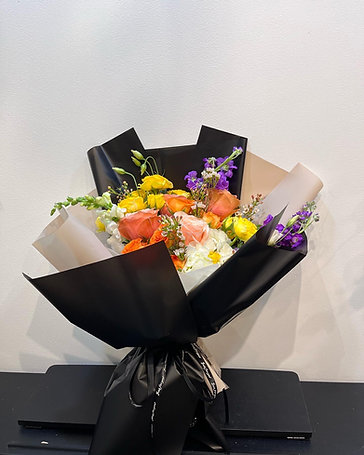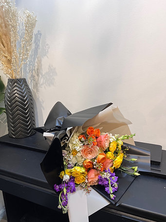 A vibrant bouquet featuring roses, ranunculus, lisianthus, spray roses, and seasonal accent flowers in warm orange and yellow tones with soft purple highlights. Designed in a fresh, natural garden style—perfect for any joyful occasion.
